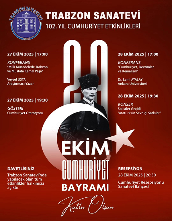 Trabzon Sanatevi olarak 27-28 Ekim 2025 tarihleri arasında gerçekleştirilen cumhuriyet etkinlikleri kapsamında 28 Ekim 2025 tarihinde saat 17.00' de Ankara Üniversitesi'nden Dr. Öğretim Üyesi Lemi Atalay konuğumuz oldu. Salonu dolduran izleyenler " Cumhuriyet, devrimler ve Kemalizm" konulu konferansı soluksuz dinlediler. Konferans sonrasında saat 19.30'da Şef Hüseyin Şılbır'ın yönetiminde solist ve koristlerden oluşan koro Atatürk'ün sevdiği şarkıları okudu.